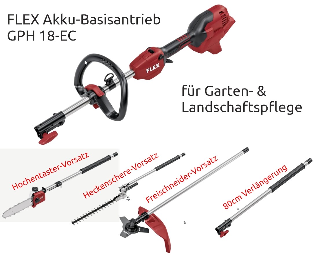 Mehr Flexibilität bei der Gartenarbeit. Die drei Vorsätze, Heckenschere, Hochentaster, Freischneider und Verlängerung lassen sich werkzeuglos in zwei Positionen montieren. Vorsätze separat als Zubehör erhältlich
