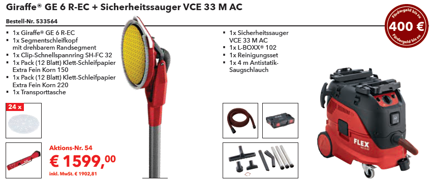 1x Giraffe® GE 6 R-EC mit 1x Segmentschleifkopf mit drehbarem Randsegment, 1x Clip-Schnellspannring SH-FC 32, 1x Pack (12 Blatt) Klett-Schleifpapier Extra Fein Korn 150, 1x Pack (12 Blatt) Klett-Schleifpapier Extra Fein Korn 220, 1x Transporttasche
